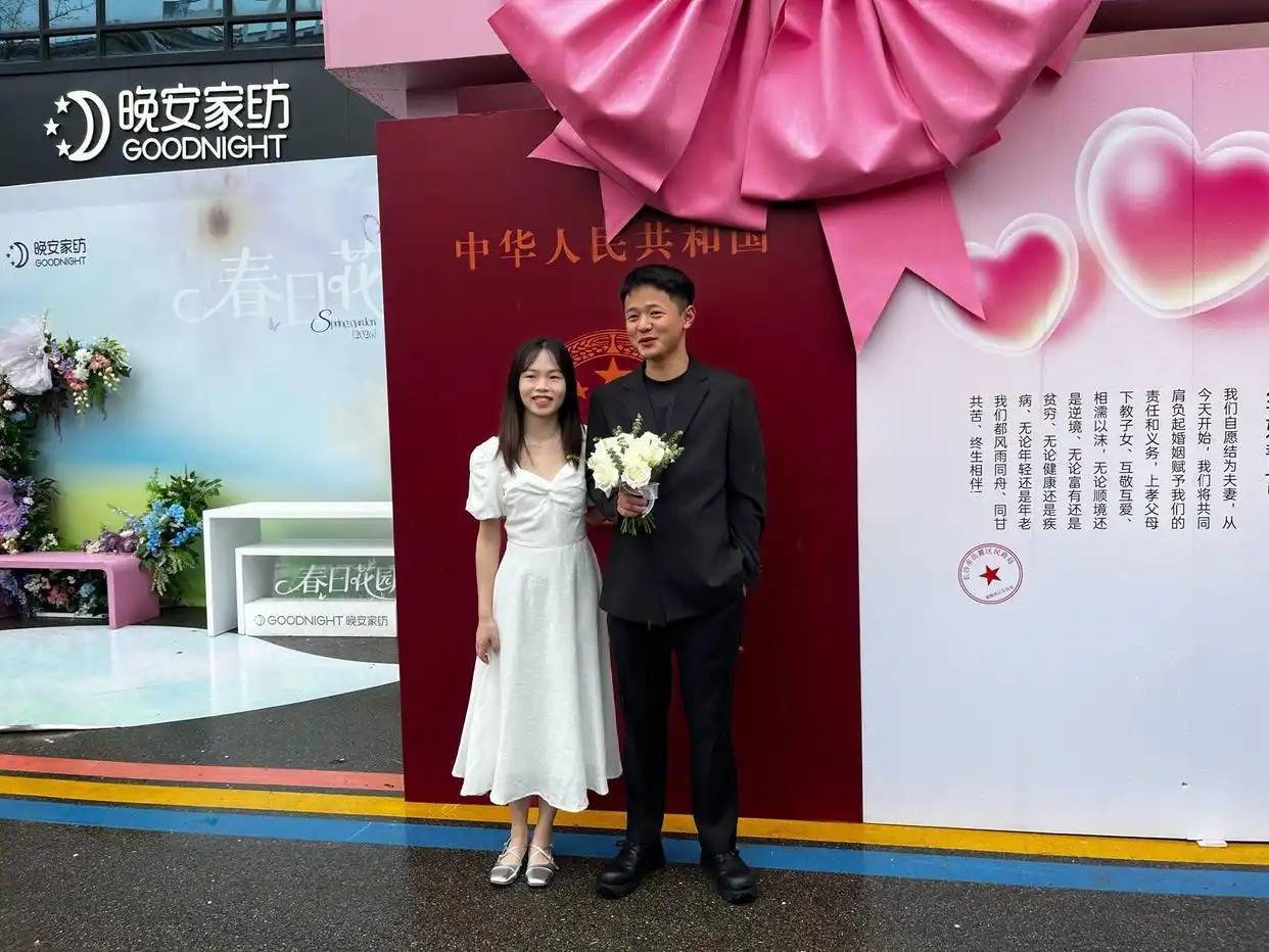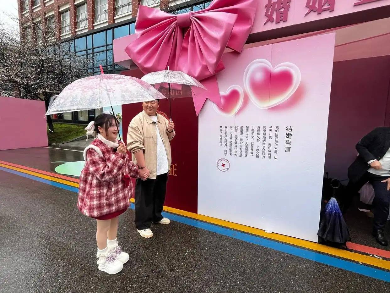 草坪四周,一片粉色花雨笼罩的区域成为全场焦点——湘江新区民政局创新将婚姻登记搬进了樱花园。“之前报名时听说线下有活动,以为是拍照或者搞氛围感,没想到是真的能领证!”刚完成登记的新人罗娜丕难掩惊喜。她和爱人黄培植原本打算5月20日去民政局登记,得知樱花季现场可以办理后,当即改变了计划。“在家门口的樱花树下领证,特别浪漫,意义不一样。”